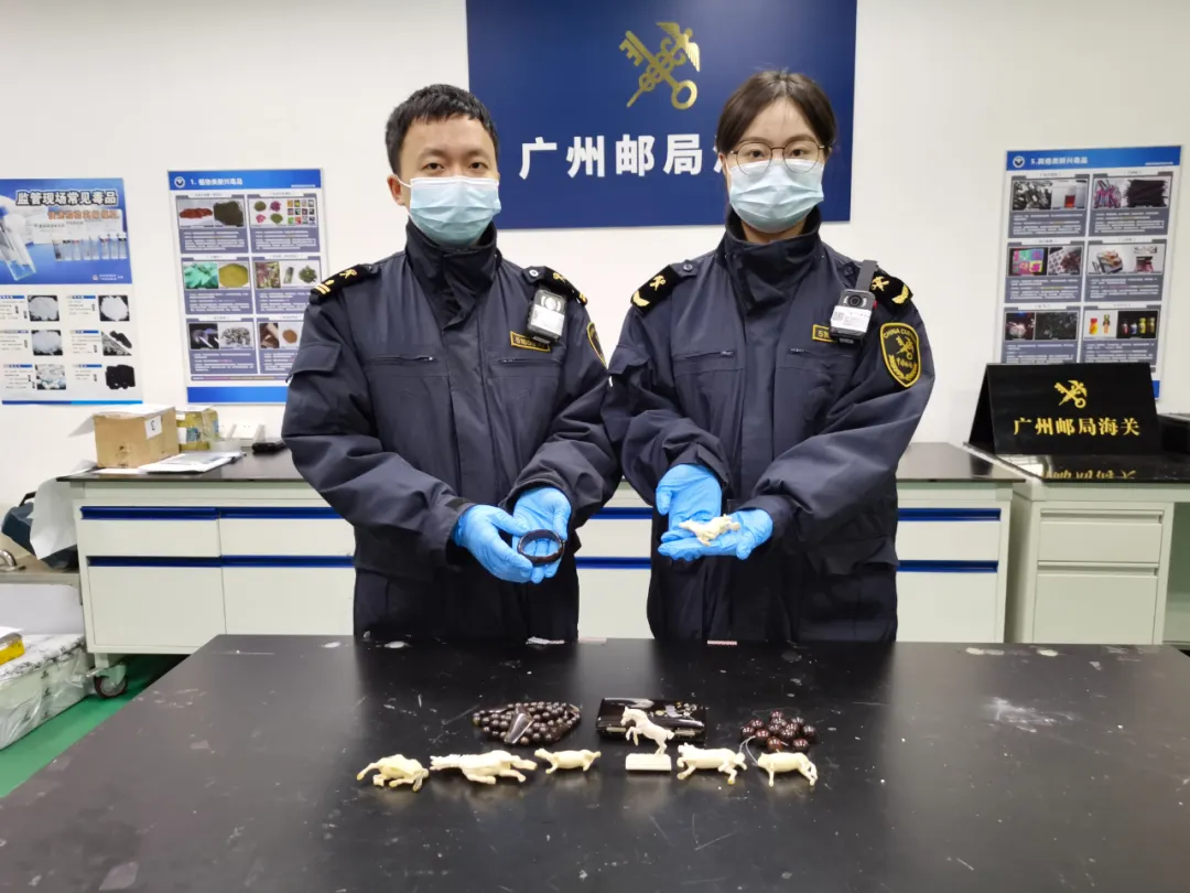 广州海关所属广州邮局海关关员在对一批进境邮件进行监管时,发现2件申报为“钟表、手表”的邮件机检图像异常。经进一步查验,现场关员发现2个邮件内共有11件饰品,其中7件为马造型雕像,外观呈乳白色,质地坚硬、色泽温润,表面具有明显的象牙特有纹理结构;4件为手镯、珠串及首饰盒等物品,外观呈深褐色,表面光滑透亮,有不规则花纹。